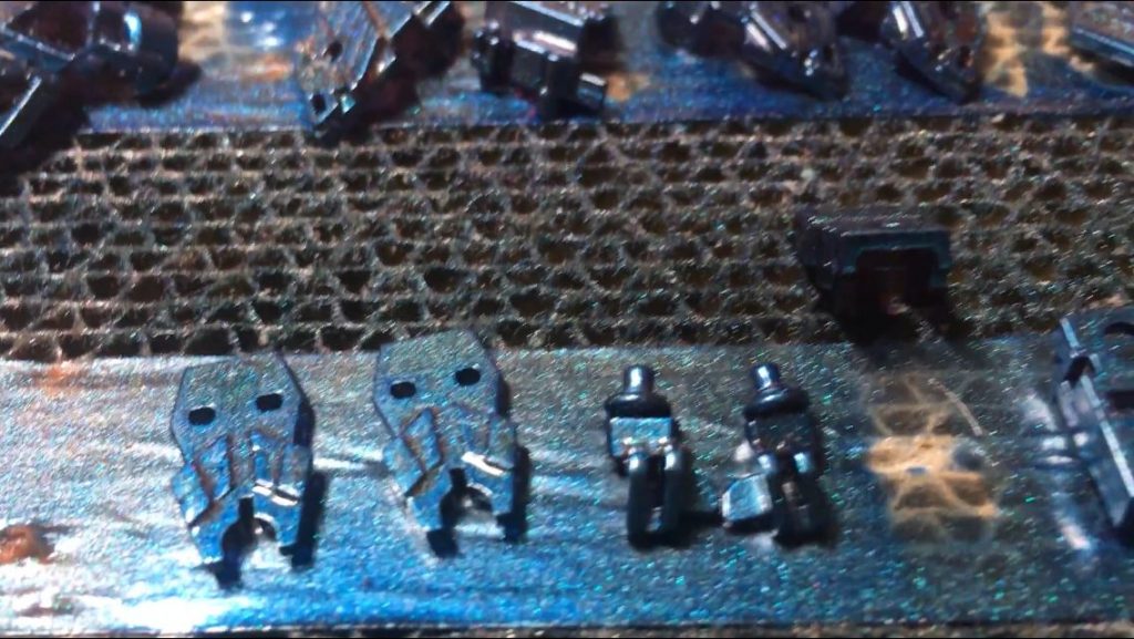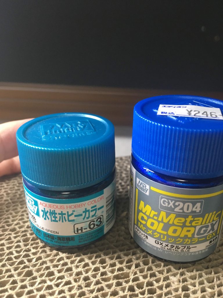 サイコフレーム部は、最初は青竹色だけだったのですが、知り合いのナラティブに衝撃を受け、メタルブルーを追加し、さらに最近話題のセリアのミラーパウダーをクリアに混ぜて吹いてみました。
