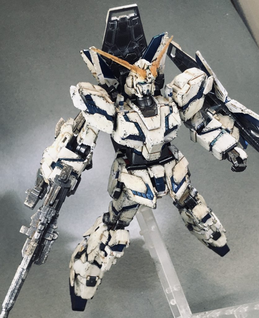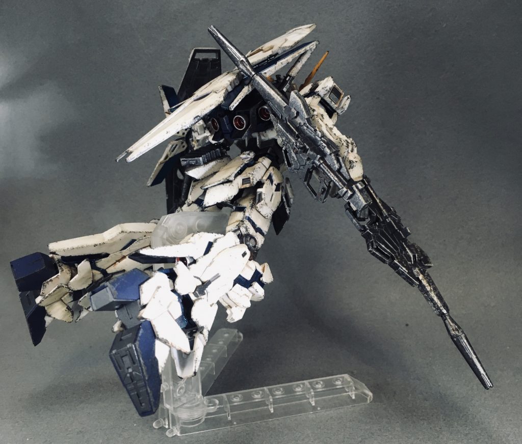 装甲のボロボロなウェザリングとギラギラしたサイコフレームの対比が楽しいガンプラになりました。
