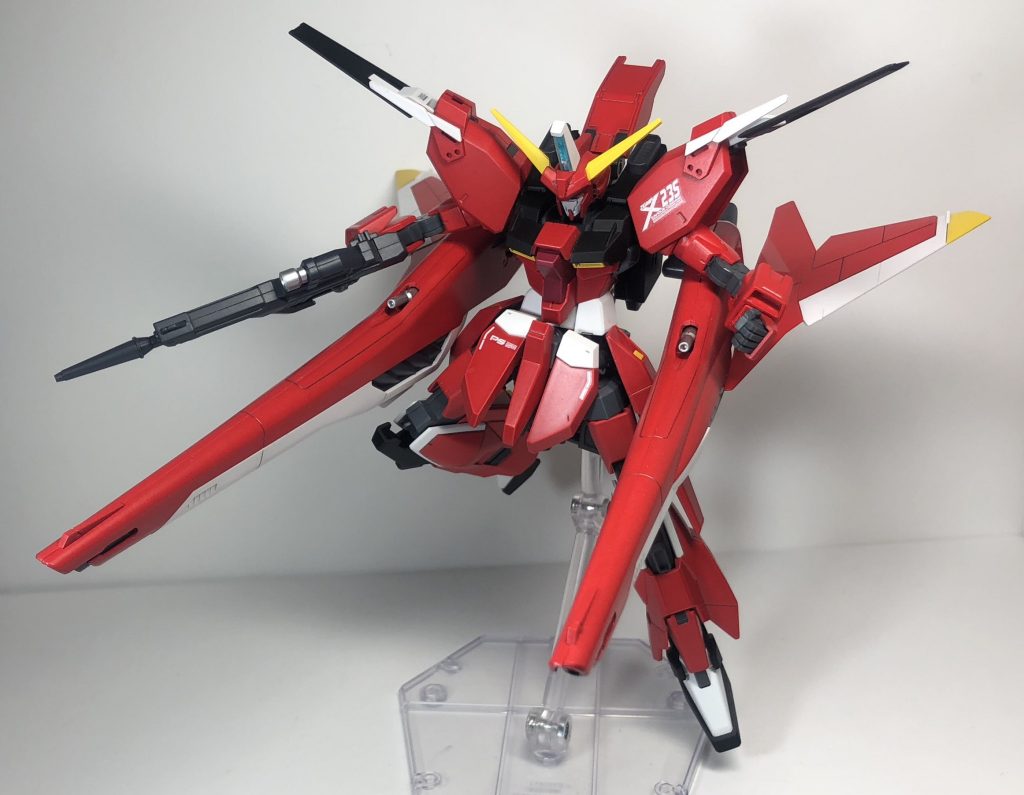 肩や武装がすこし大きくなってずっしりしてるけど、ライトニングガンダムのパーツによって引き締まって見えてとってもかっこいいです!!
