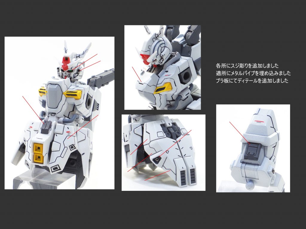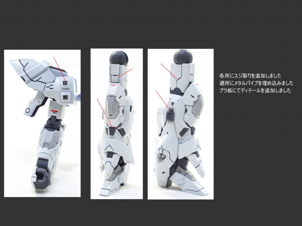 HGUC ムーンガンダムを色変えして製作しました。 各所にスジ彫りやプラ板にてディテールを追加しました。 一部ダクト内部にはメタルパイプを埋め込みました。