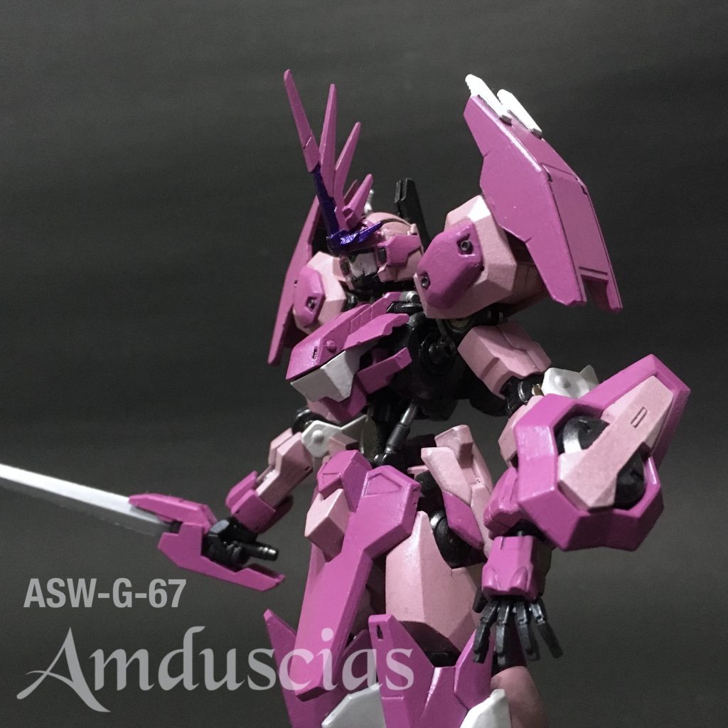 ASW-G-67 アムドゥスキアス。厄災戦時に稼働していたガンダムフレームの1機。72機のなかで珍しく、女性が駆り、機体自体もどこか女性らしさのあるシルエットになっている。カラーリングはパイロットの好みでパールピンクとマゼンタを基調にホワイトの刺し色。