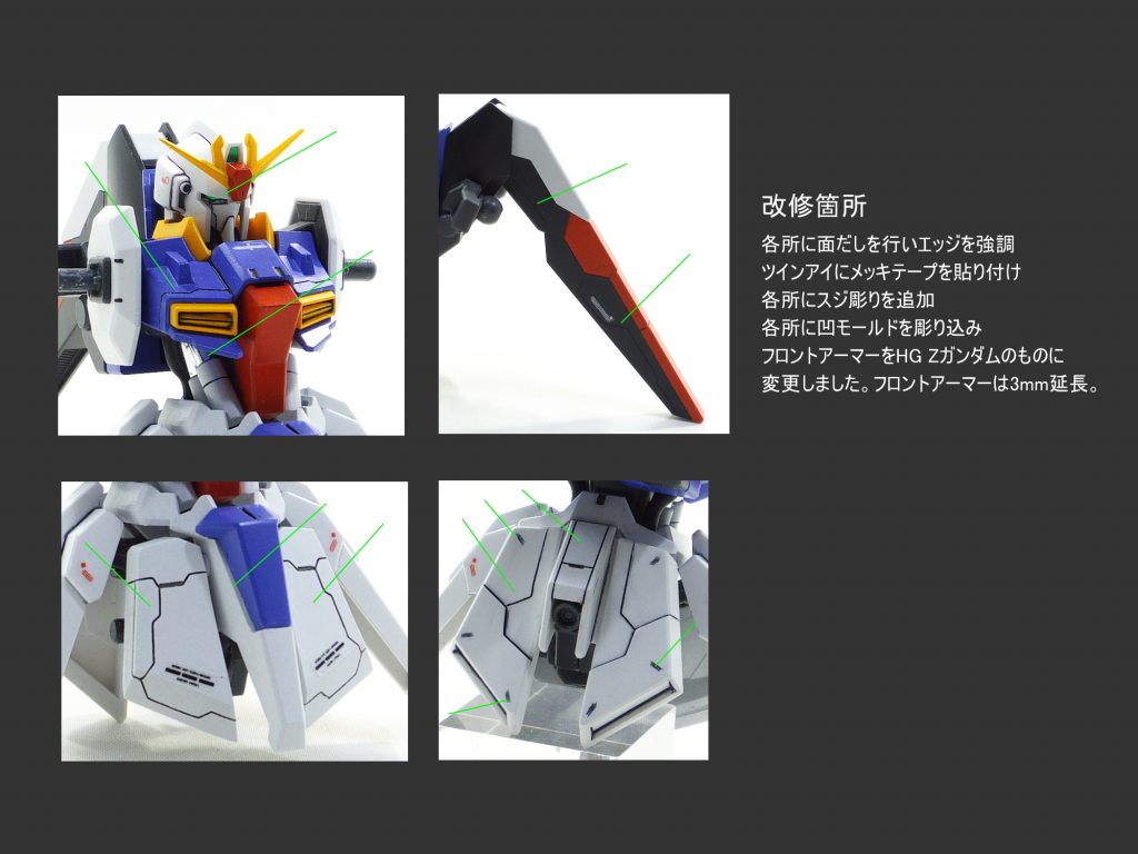 HGBF ライトニングZガンダムにHGUC Zガンダムのパーツを流用し 組み合わせられるようにして製作しました。 適所にスジ彫りやディテールの彫り込みをしました。
