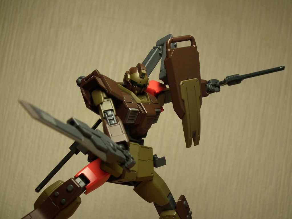 ベースは陸戦型ジムですが、紆余曲折あって様々な機体のパーツが入り乱れております。左肩、右腿、頭部はブルーディスティニー、バックパックはウィングガンダム、サイドスカートはクロスボーンです。