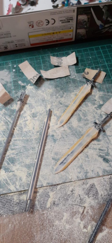 槍の矛先はランナーを束ねてパテで整形。双剣はグレイズリッターの剣に、バエルの剣を繋ぎ合わせてパテで整形。