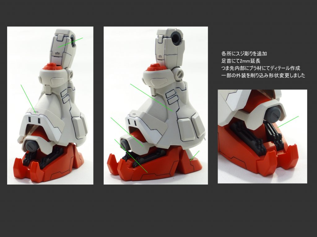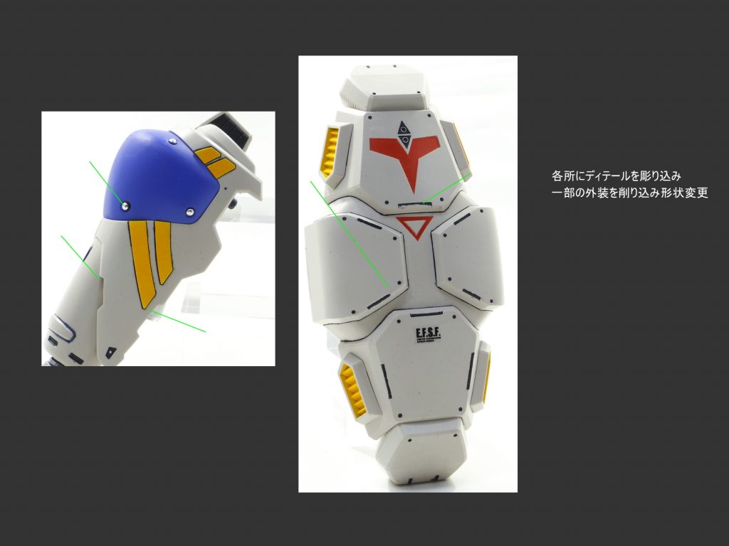 各所にスジボリにて情報量を追加して塗分け 太ももをパテにて幅…