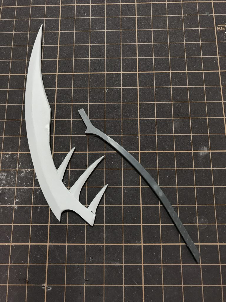 ミキシングで楽に済ませたかったのですが、こういう巨大な曲刀はガンプラ界には珍しく。不本意ながら今回はじめての武器スクラッチに手を染めるハメになりました。