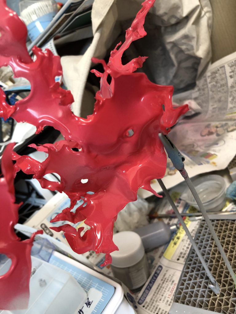 光の翼はエヴァピンクを全体に塗ってから残ったピンクにクリムゾンレッドを混ぜて軽く吹きます!その後に角や曲がった場所を中心に橙色を吹きしました(*'∀'人)♥*