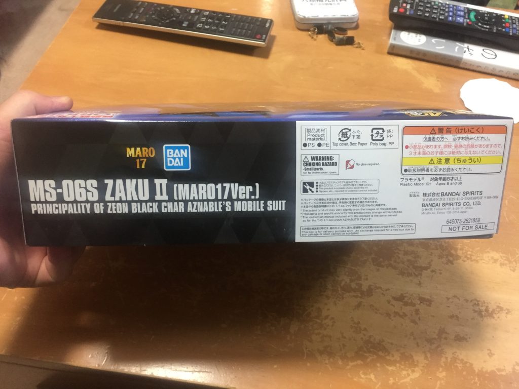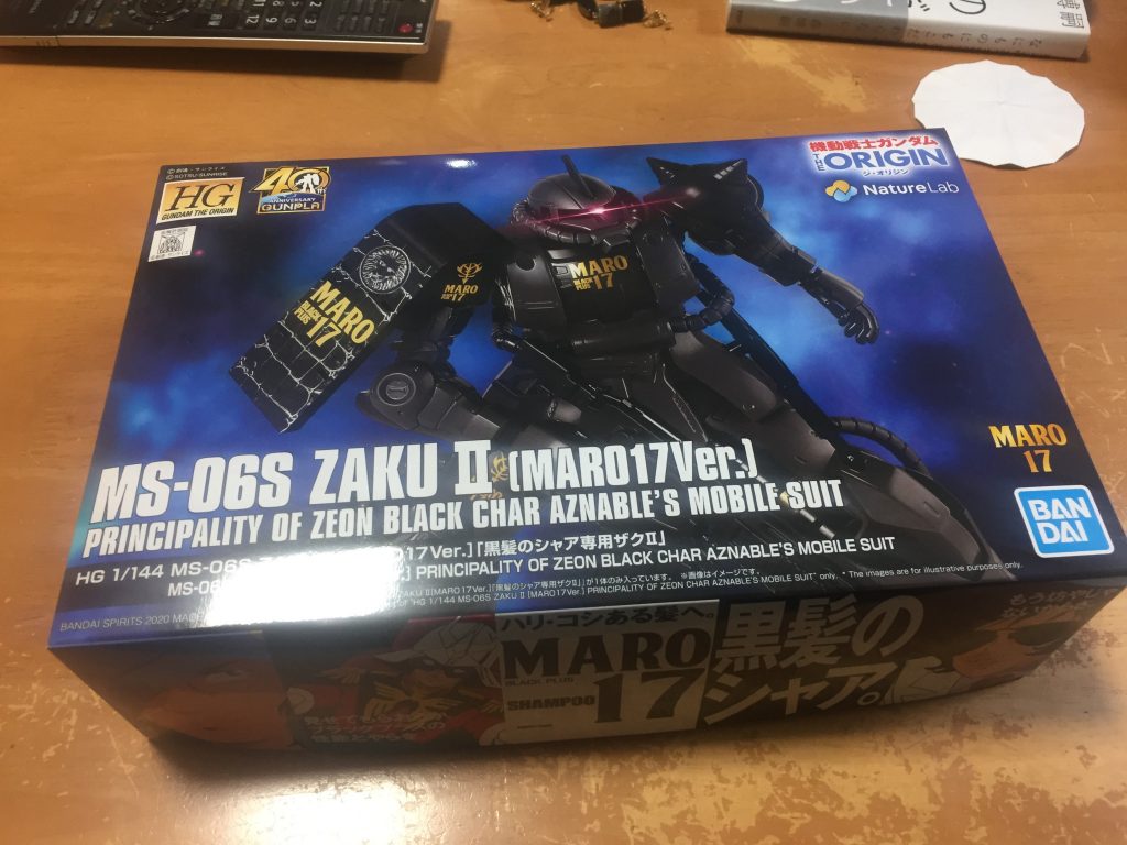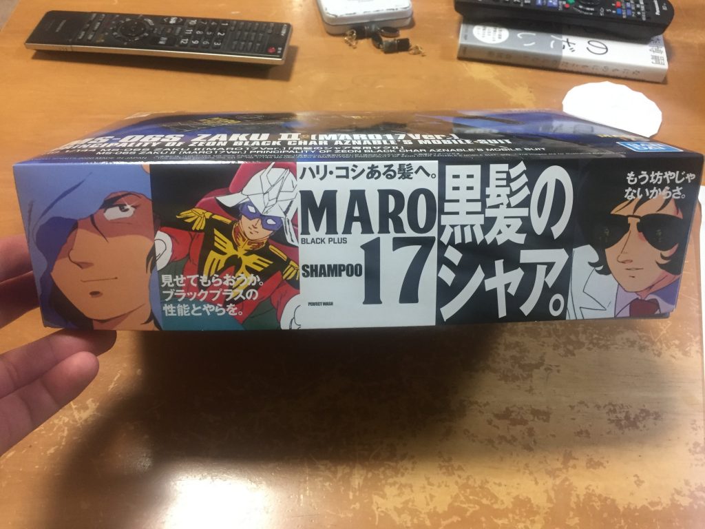 金型としてはオリジンシャアザクですが、Maro17モチーフのシールが付いてきます。その価値がほとんどシールに集約されているというのに、シール貼るのクソ下手くそ…すいません。