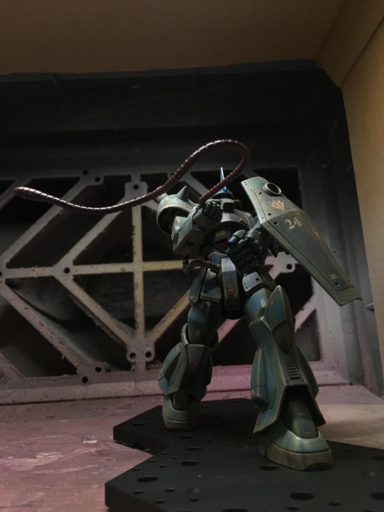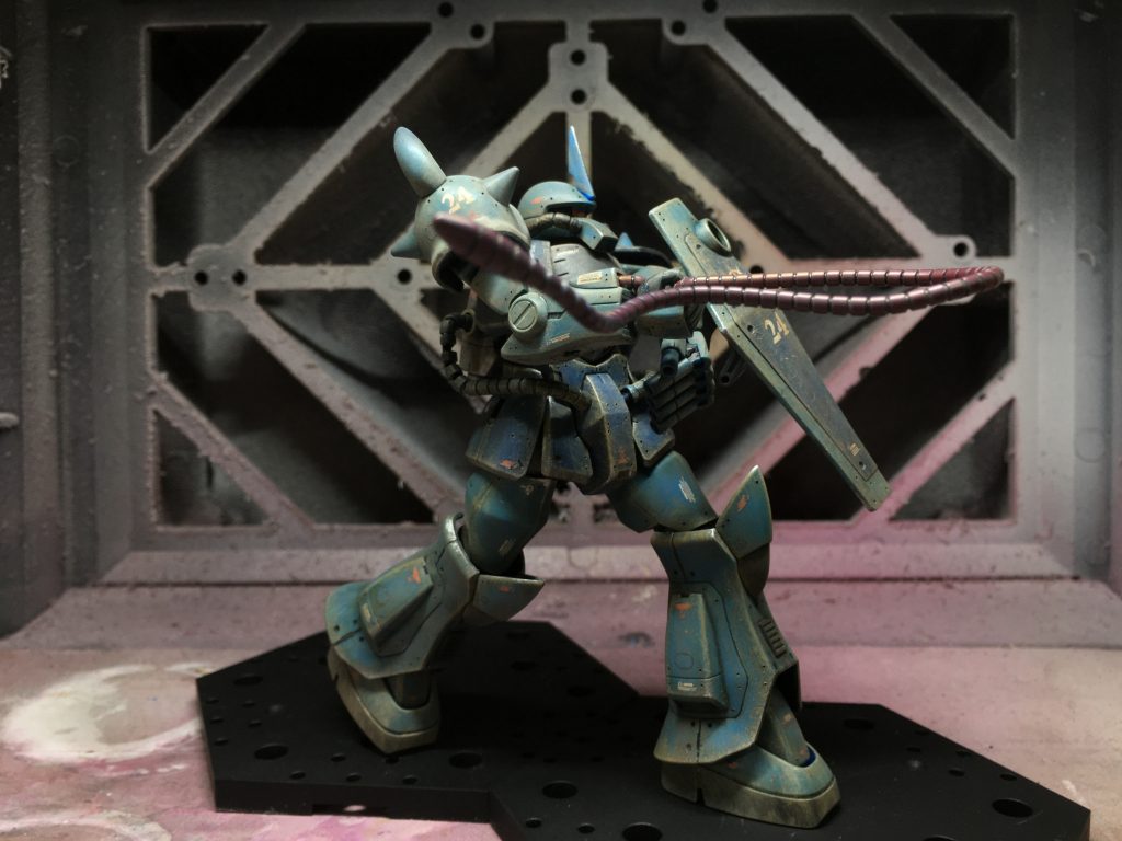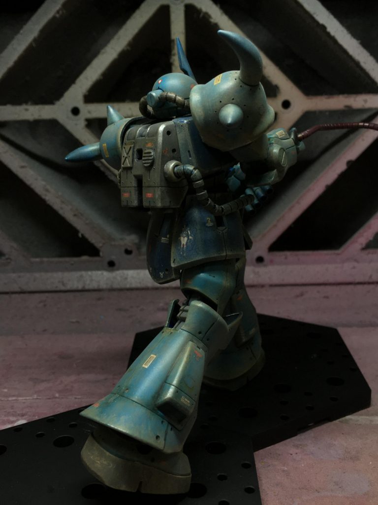 ウェザリングの技術が素晴らしいです!「重力戦線」に出てきそうなグフですね。グフレディのデカールも良いアクセントですね。