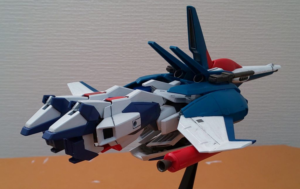 リ・ガズィといえばバックウェポンシステムが特徴ですが、戦闘機形態からMS形態に変形する時に排除する方式がとられています。使い捨ての装備にしては高価なため、後継機のリ・ガズィ・カスタムではBWSを小型化、背面に折り畳まれる方式に改良されました。