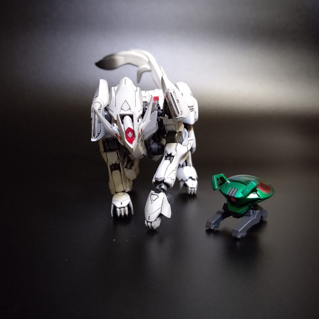 以前から、いつか作りたいと思っていたネタですが、今回は鉄血コンとのことで制作してみました。本当は、獣型⇒人狼型⇒人型と変形出来る物を作りたかったのですが、自分の納得のいく獣型のためには他の形態での胴体の長さに問題が…結局今回は一番再現したかった獣型のみでの完成としました(´ノω;`)