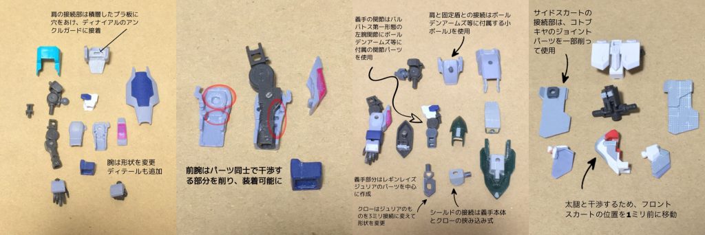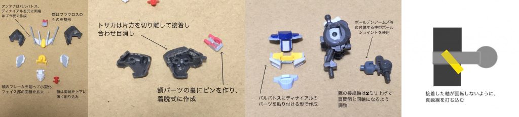 この他にも、腰部のボールジョイント下にプラ板を2mm分敷いて、胴体を延長しています。