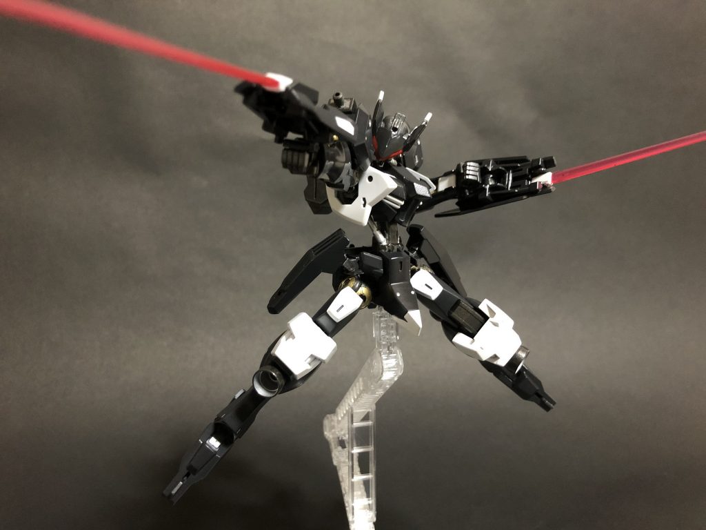 色々とポージング。殲滅戦仕様はコンセプトにあるように単機で複数の敵を殲滅出来る用に作られている。アルテミスには、ガンダムフレーム特有のセンサーアイに加えて、頭部に第3の目とも言える大型センサーを装備している。これにより、索敵範囲が向上し、敵の射程外からの遠距離射撃を可能としている。また、それに加えて、アルテミスにはエイハブリアクターを3基搭載しており、これはヴィダールと同じように、自身の識別を誤魔化すためでもあり、3基のリアクターの出力を上げる事によって、広範囲のジャミングを可能としており、敵の統率と電子妨害を目的としている(実際、「リアクター増やしてそんなことできるのか?」という疑問もあるけど、出来そうと思ったのでオリジナルで考えてみた)。