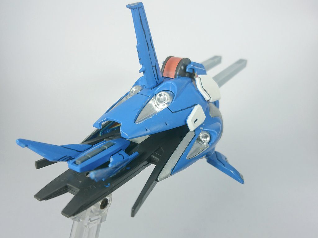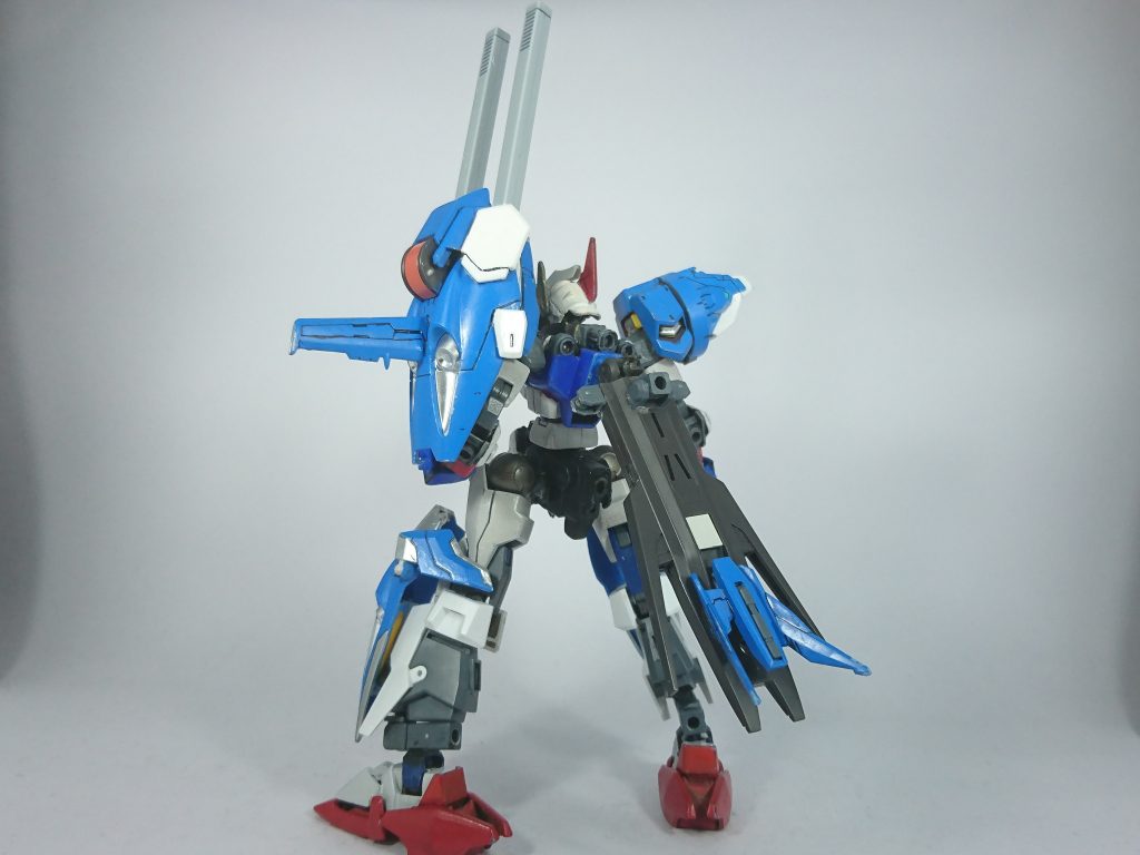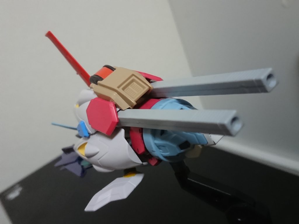 武装は左肩のバインダーにある2連装キャノンやヒレカッターとシンプルですが、右肩のプトレマイオス部分の口部分も開くままなので砲撃可能です
