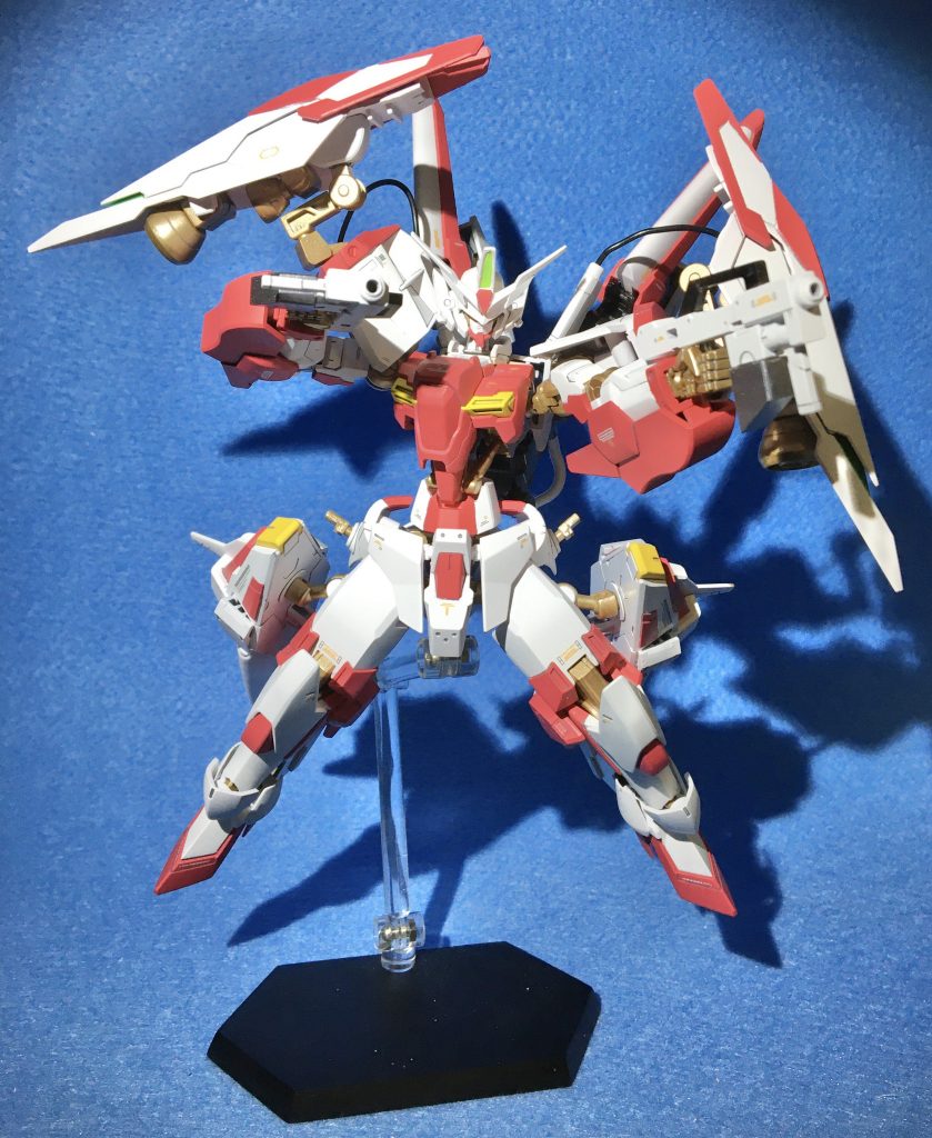 クアンタの下腹部を用いて高身長化、処理が面倒なジェミナスアームには、百里のパーツをポン付けする事で、作業の効率化とディテールの追加を行いました。