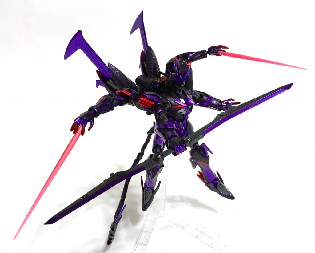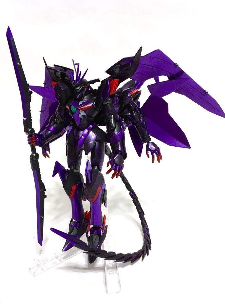 塗装はメタリックバイオレットを下地にして、フラットブラックをラップ塗装でペタペタと塗って悪魔っぽく。またメタリックバイオレットそのままの箇所でメリハリを。挿し色はレッド+クリアレッド、フェイス部と胸部の一部にアイスシルバーです。