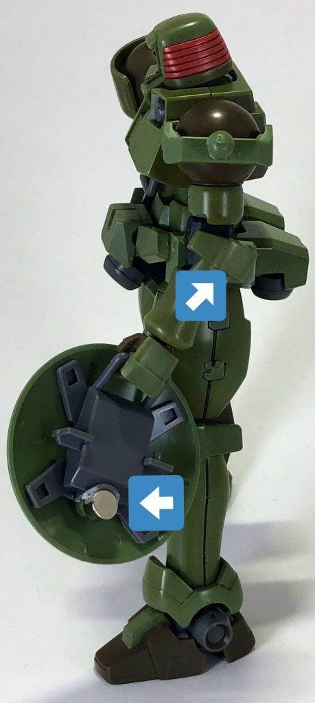 盾のボールジョイント受け部分と腕の矢印部分に磁石を仕込んで手だけでしっかり盾を持てるようにしました。この改造を思いついたのでリーオーの改造を始めました。