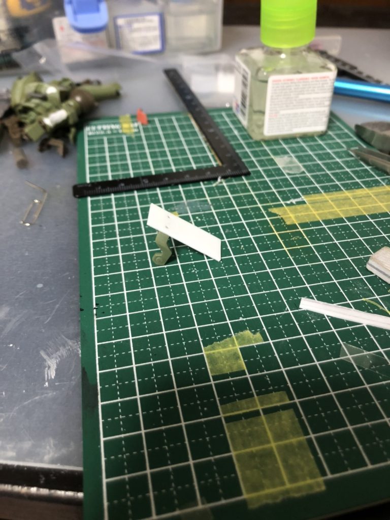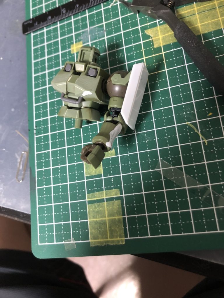 盾を肩に着けられなくなったので、代わりにザクのような肩シールドを作成しました。セメント接着だと不安だったのでクリップを切ったもので補強しています。