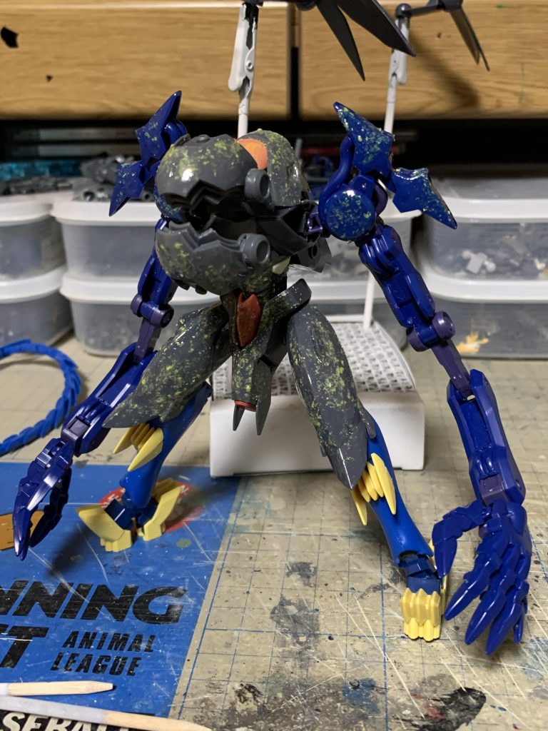 塗装は生物的な表現になるように、サフを吹かず下地の色が出やすいようにし、筆塗りを一回だけ、ムラも直しておりません。てかりもそのまま。生物の表皮っぽく見えるでしょうか?