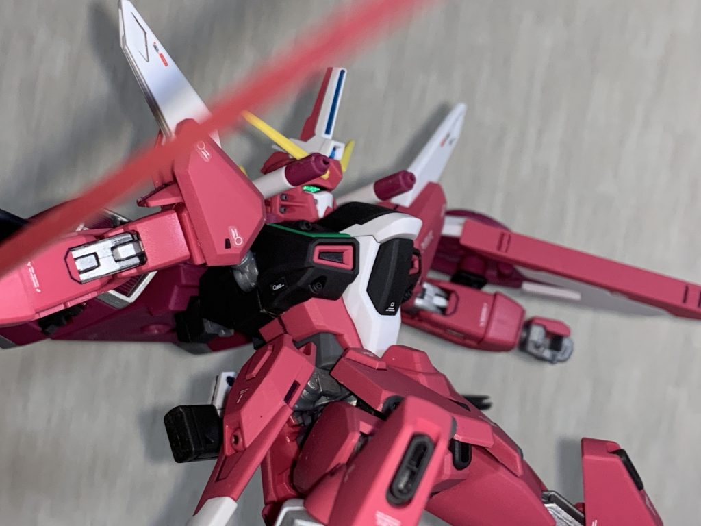 HGCEの♾ジャスティスです。デカールを貼った以外は簡単フィニッシュの予定でしたが、関節のゲート跡が目立つので関節含めシルバー部分を塗装し仕上げてあります。