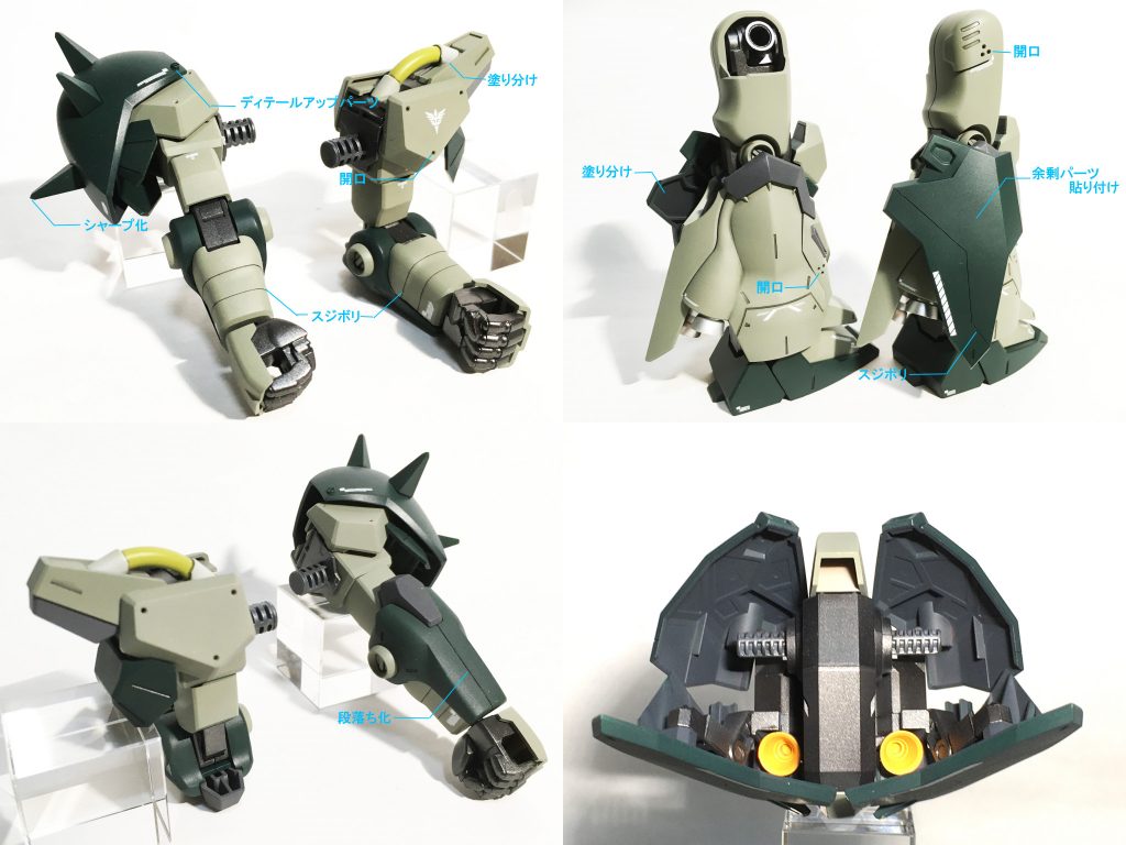 カラーリングをジオンらしいグリーンにしつつ、アンテナや脚部装甲を付けて指揮官機をイメージしたデザインに変更しました。