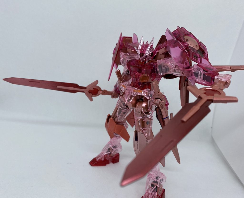 ガンダムベース限定のダブルオーダイバー(トランザムクリア)をポリキャップ以外の黒いパーツを塗装したものに、別売のダイバーエースユニットをトランザムカラーに塗装して合わせました(^^)