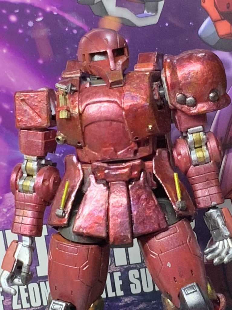 でも、センサーを増設したり肩にキャノンを付けたりで、ゲラート少佐の旧ザクっぽくていいですね(ちなみにゲラート少佐は「ジオニック・フロント」というゲームのキャラクターで、一年戦争中に固定バズーカやら音響センサーやらで改造しまくった旧ザクでガンダム6号機を撃破したやべェお人です)。