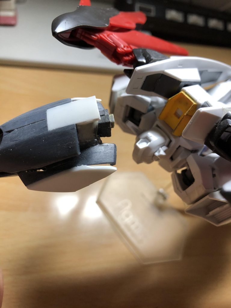 故に製作過程で変形時の形状を優先し肩アーマーの一部を切除した以外は、元に装甲等を貼り付けていく形で製作しています。