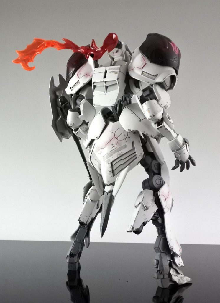 やや異形なシルエットとユニコーンDMモチーフにした配色、血染めのような赤いメタリックな肩、腰から出たボロボロのローブで見るものに畏怖を感じさせる怪しい雰囲気が出せたかなと。