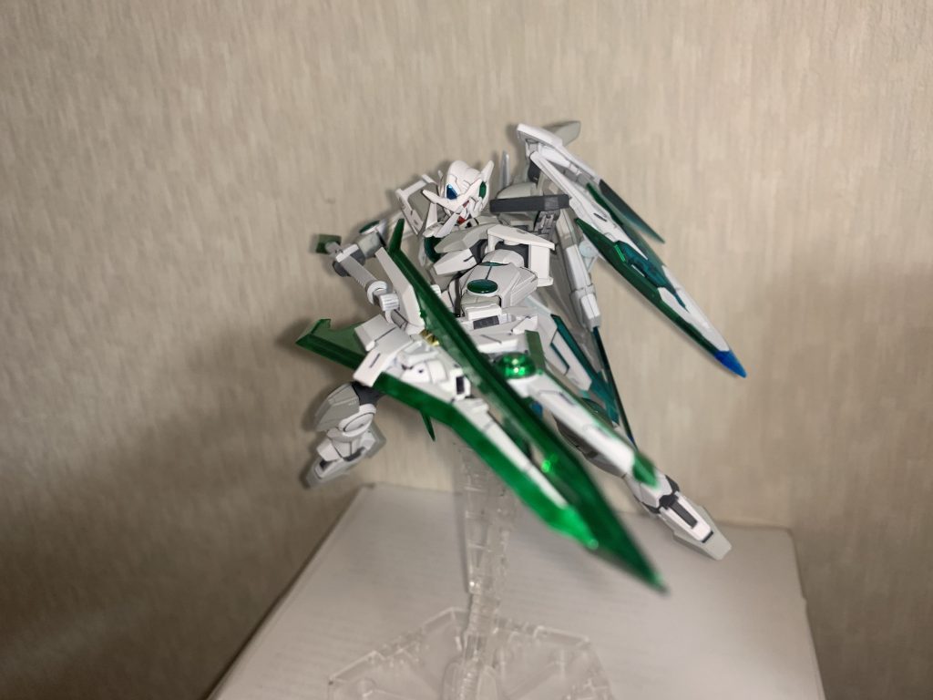 他変更点で、頭部はブレードアンテナ以外はクアンタに変更し、サイドスカートをジャスティスナイト(インジャの余剰パーツ)にしています。こちらは換装式でクアンタのものも使用可能にしてあります。