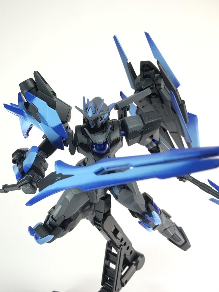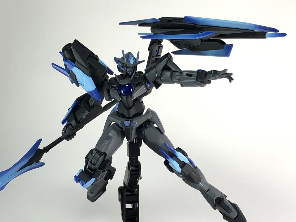 周りを取り囲む蒼い鬼火と黒系の暗色系の塗装と青系の差し色が機体名を現しているのが良く解ります。トランザムシステム発動状態を再現されているのもかなり良いですね。