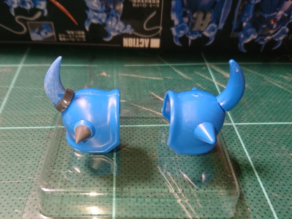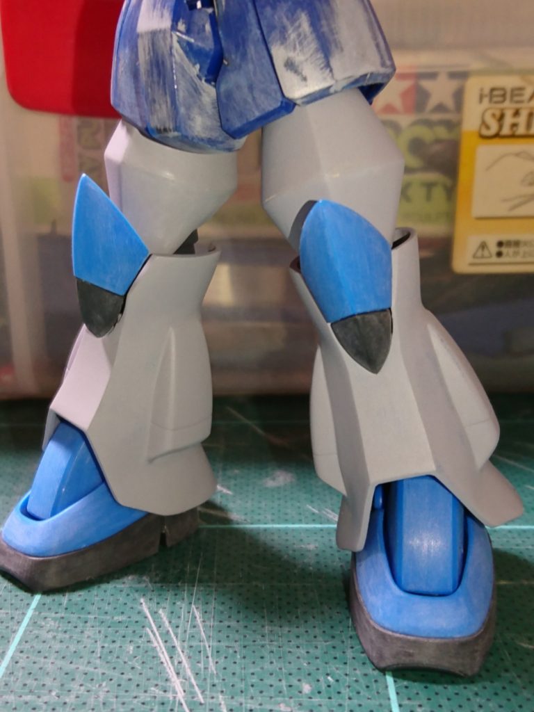 主な改造箇所は、太ももの大型化、スネとバックパックをアニメ設定ぽく形状変更、モノアイレールの幅詰め、スパイクアーマーの二段化、ヒートサーベルの鞘 及び盾への連結方法、などです。