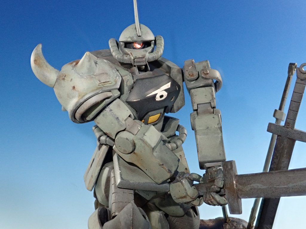 グフはHG3種からパーツ取りを行った上で全身を徹底的に改修し,劇中の形状に変更しています.
