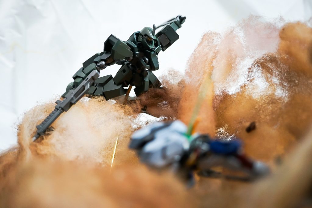 作り出し当初は後ろにモビルワーカー置こうかと思ったんですが、煙の量を考えるとかなり後ろに置くか煙を不自然に避けなきゃなのでやめました