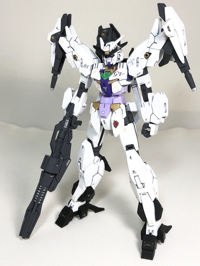 肩にはアインフェリアのユニットエンブレム、胸には機体名の略称である「GV」、フロントスカートにはワンポイントとしてイチゴのデカールで飾られている。