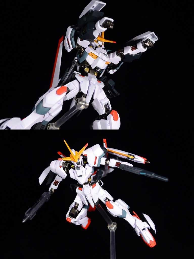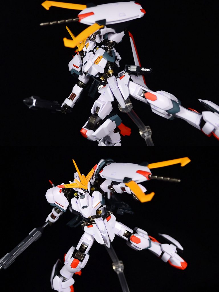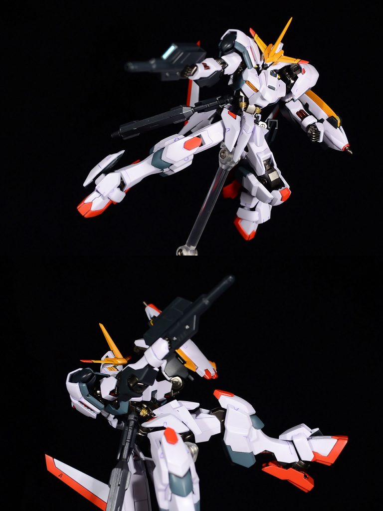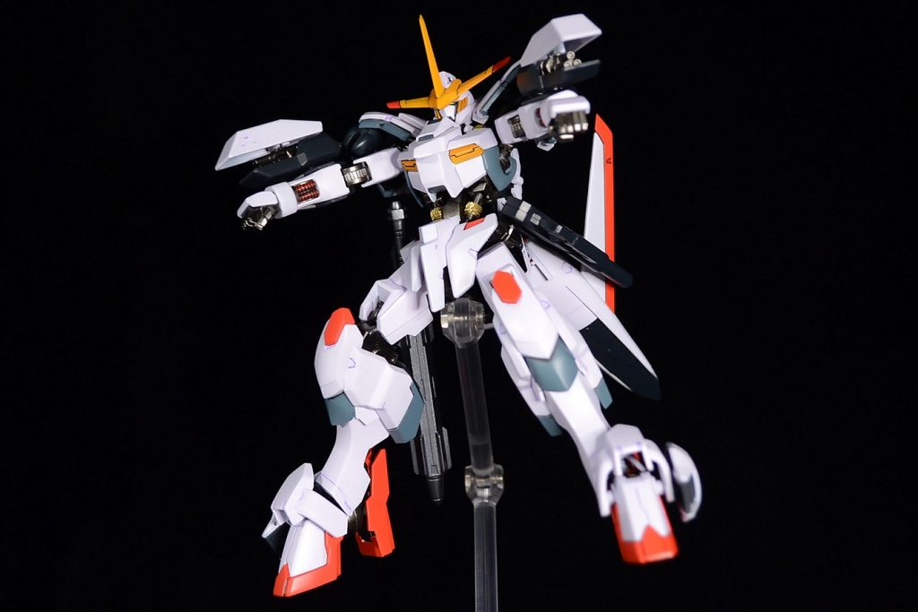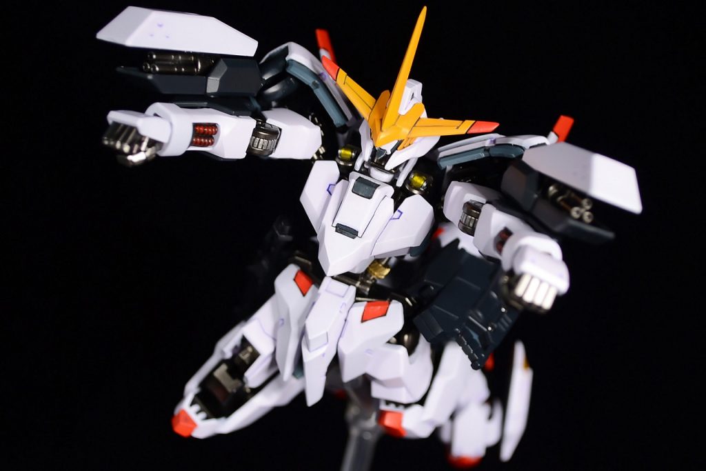 主な工作は各部シャープ化、合わせ目消しや肩部へのバーニアパーツ追加、ビルドハンズ使用、腹部シリンダーのメタルパーツ化、武装の追加となります。