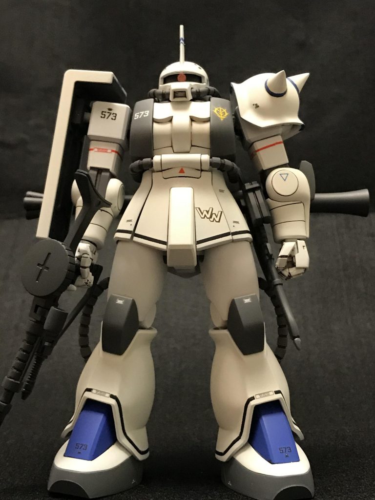 太腿を2mm延長、頭部を上下に1〜2mm短縮。アンテナは自作。後は基本工作のみです。付属のマゼラトップ砲が欲しくて購入していたのですが、HGUCザクがリバイブされてこれはいよいよ旧HGUCは作らなくなってしまうぞと思い製作した次第です。