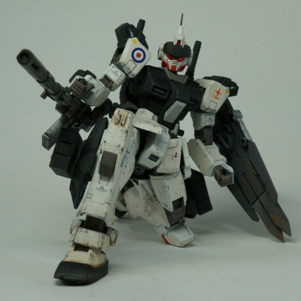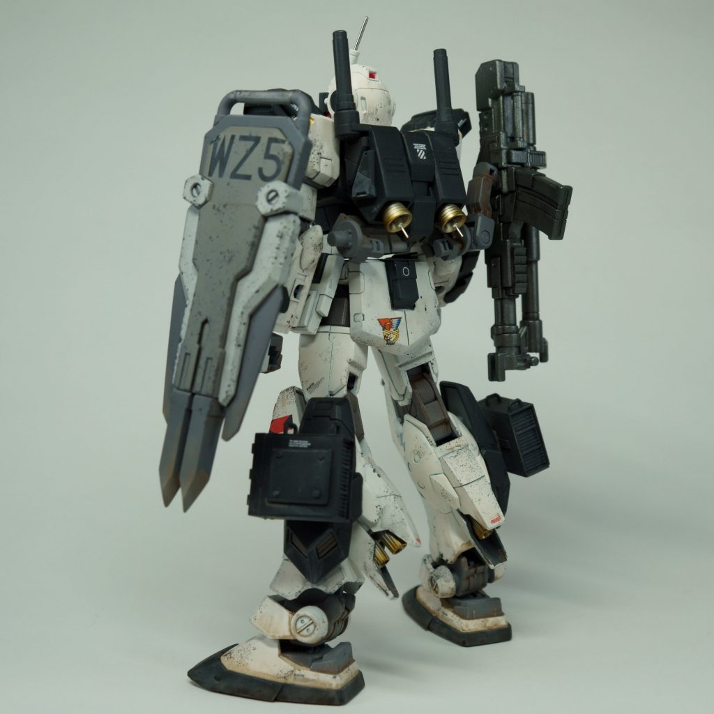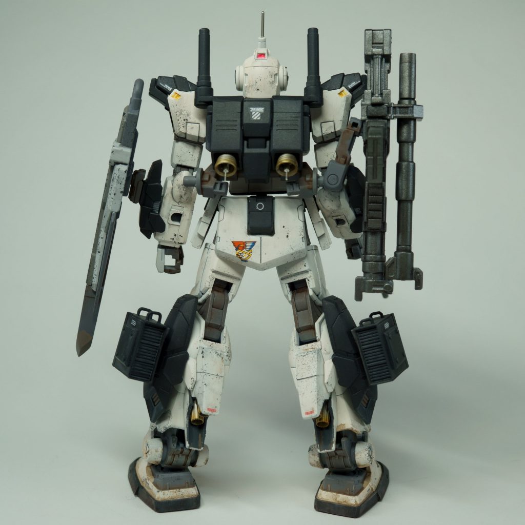 陸戦型を意識して、フロント・リヤのスカートアーマーと膝下の排気口のようなモールドを埋め、脚部ミサイルポッドにプラ板と金属線でモールド追加、バックパックもスカートと同様にバーニアモールドを埋めました。またビームサーベル位置をサイドスカートからバックパックに移設。デカールは手持ちの中から余っているものを使用しました。リヤスカートのデカールはスレッガーさんのものだそうです。無理にでも使わないとずっと余りそうなので、かっこよければいいのだ的に使ってみました。