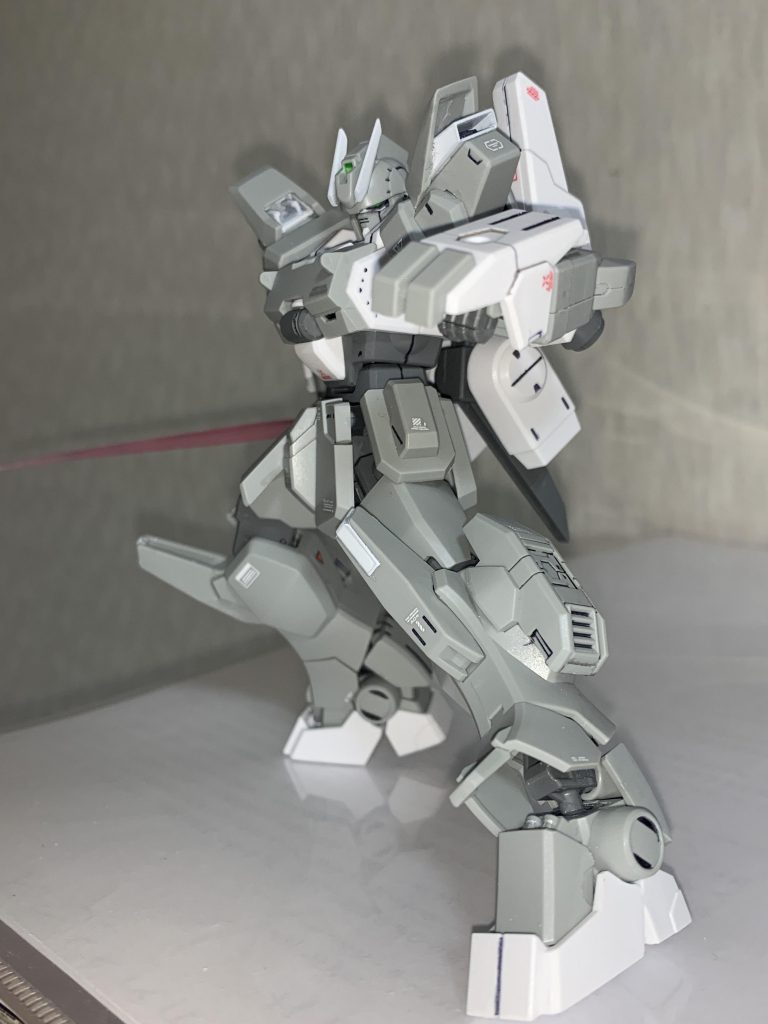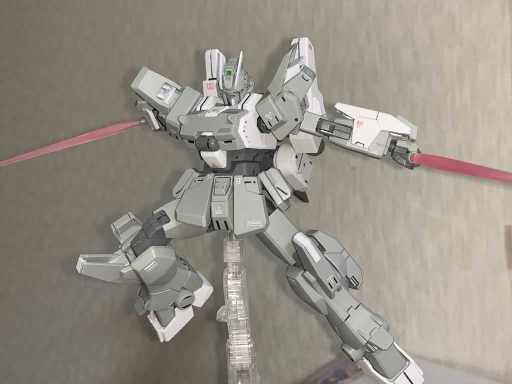 イントルーダーにセンサーシールドとビームライフルを持たせてベーシックにしています。シール部分であるブレードアンテナと膝の白部分は塗装、ツインアイも黒で縁を塗った後シールを切り取り貼っています。唯一の改修点はショルダースラスターの増設で、Ez-SRの余剰パーツを削って貼ってスラスターに見立てています。