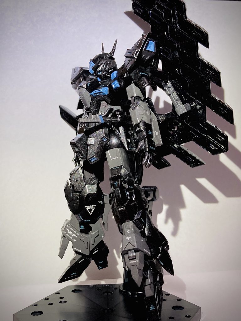 元はツヤ消しの黒ベースだったのを宇宙感を出したくてガンメタを吹いたところ、微妙な感じになってしまいました…これに懲りずまた黒い機体を作成したいです!