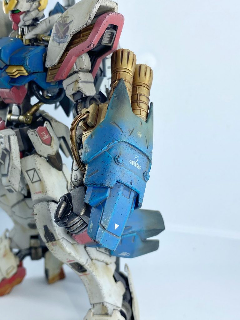肩はシャイニングのものを使ってますが、そのままだと、なんとなく鉄血の世界感に合わない気がしたので、パテで丸みを持たせてみました。