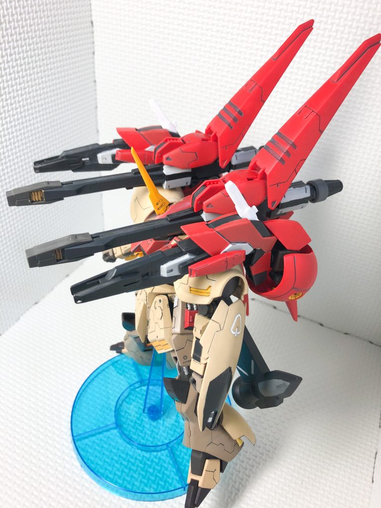 別角度からの写真です。バックパックには、Rジャジャの腕回りも使用しており、砲撃時の反動を軽減する目的でバインダーをつけています。バインダーを展開すると、シルエットが一気に変わるので、良い感じです。