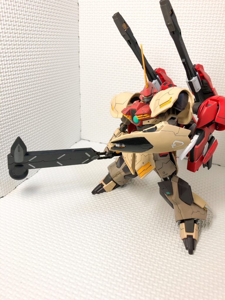 手持ちの武器を構えた姿になります。バックパックを作るに当たって、グシオンリベイクのようなサブアームの要素も取り入れようと考えて、稼働軸を増やしました。Rジャジャの肩は、攻撃もできて、可動域も広いので、色々な角度からの攻撃に対応できるようにと採用しました。