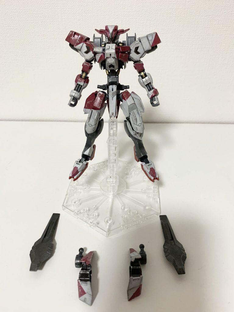 前 特徴として左右非対称のカラーリングにしてみました。厄祭戦当時はグレーを基調とした渋い色合いでしたが現パイロットの趣味でカラー変更されたという設定です。弱冠の塗装失敗部分がありましたのでウェザリングとチッピングでごまかしとります_(:3 」∠)_