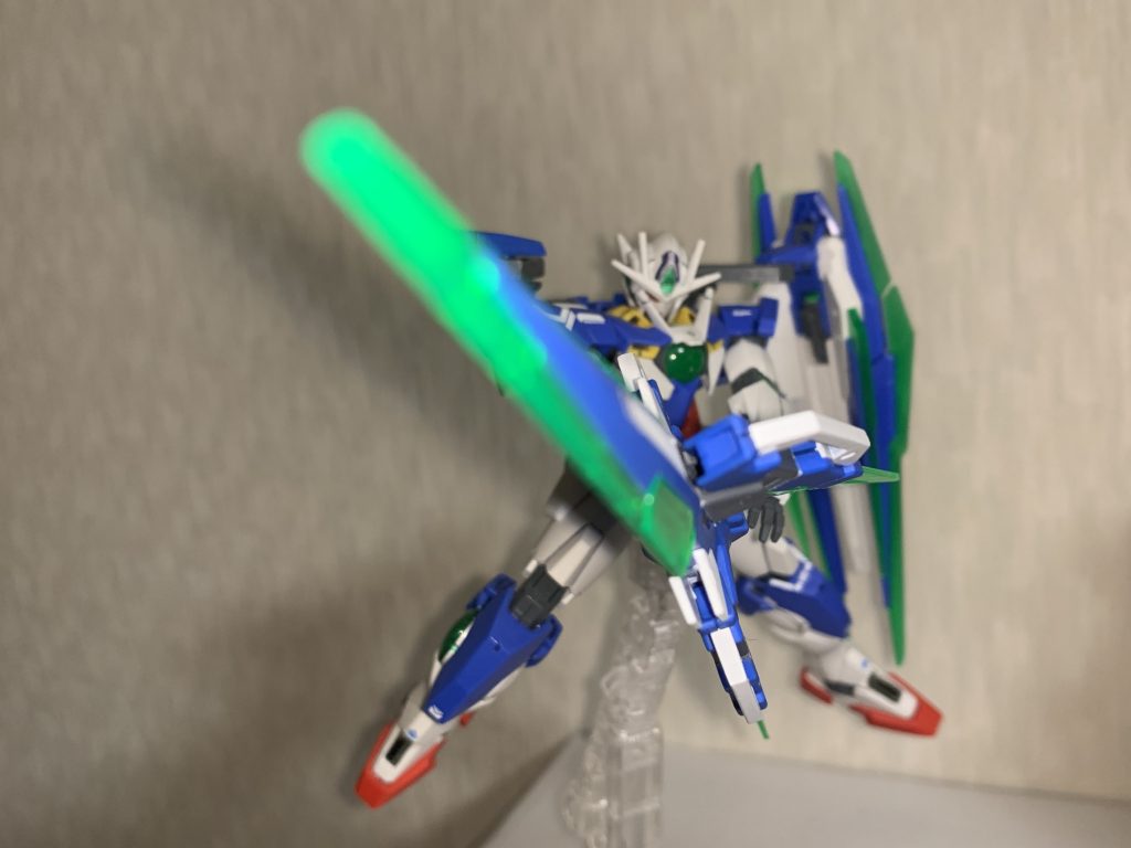 青は形成色を使い、白、グレーを塗り分け、デカールはHGクアンタ用の物を使用しています。また、フルセイバーとアームの接続部、アーム本体にもポリキャップを仕込むことで保持力を上げています。