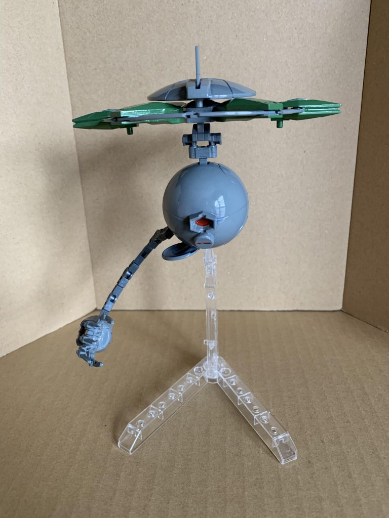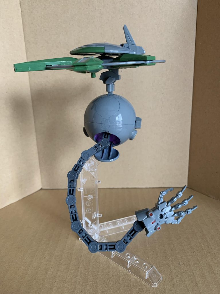 頭の上の飛行ユニットはインジャウェポンのシールドとネプテイトを組み合わせ、腕は30MMオプションパーツとボルアムの関節パーツを繋いだだけの代物です。