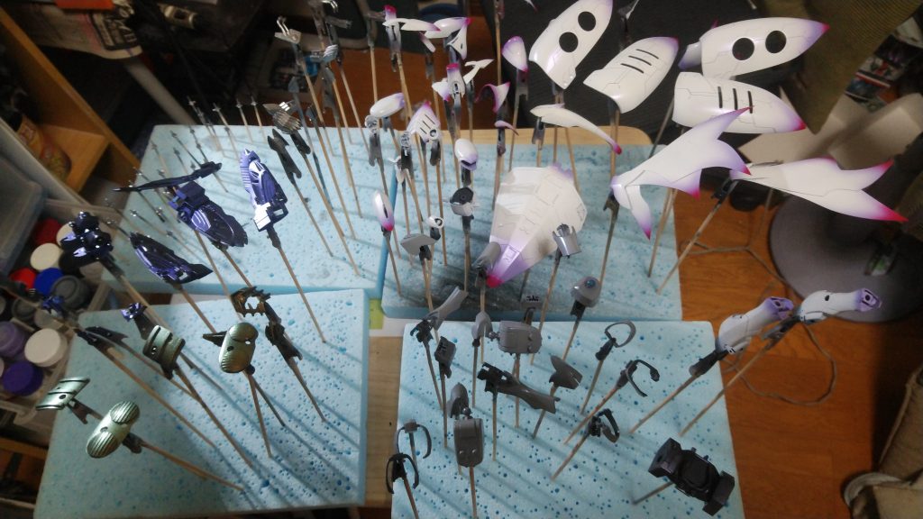 各種筋彫りを追加したのと、塗装は赤と紫のグラデーションをしたのちにクリスタルカラーのアメジストパープルを上掛けしました。カラーイメージは花に擬態する花カマキリをイメージしてます。