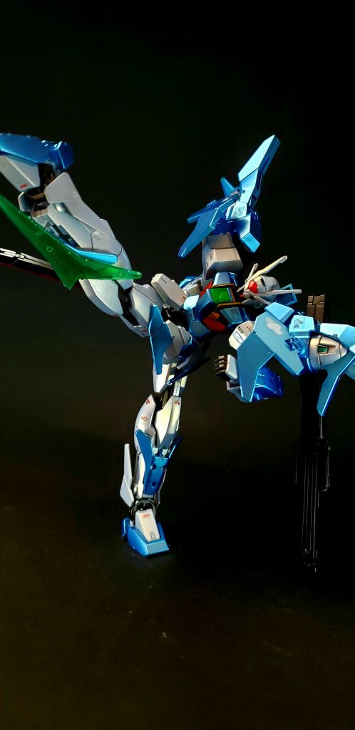 シバ・ツカサとの戦いで大破した00ダイバーエースを大改修した姿[32]。リクが過去の戦いで得た経験と、デスティニーガンダムをはじめとした他作品の機体の要素を加味した改修が加えられている。過去の戦いを忘れないためという理由から、胸部上面のクリアパーツ内には改修前のダメージ痕が残されている。ツインドライヴユニットはデスティニーのウイングユニットを組み込んだ「スカイドライヴユニット」へと強化され、GN粒子を巨大な光の翼に変化させて推進力を高めたり、巨大なビームソードやビームシールドとして転用することもできる。近接格闘時は、ユニットを腰の位置に下げることで低重心化と敏捷性を高めた「ラッシュポジション」に変形する。