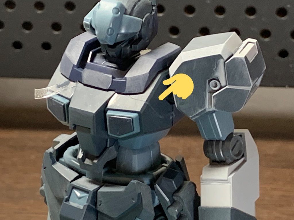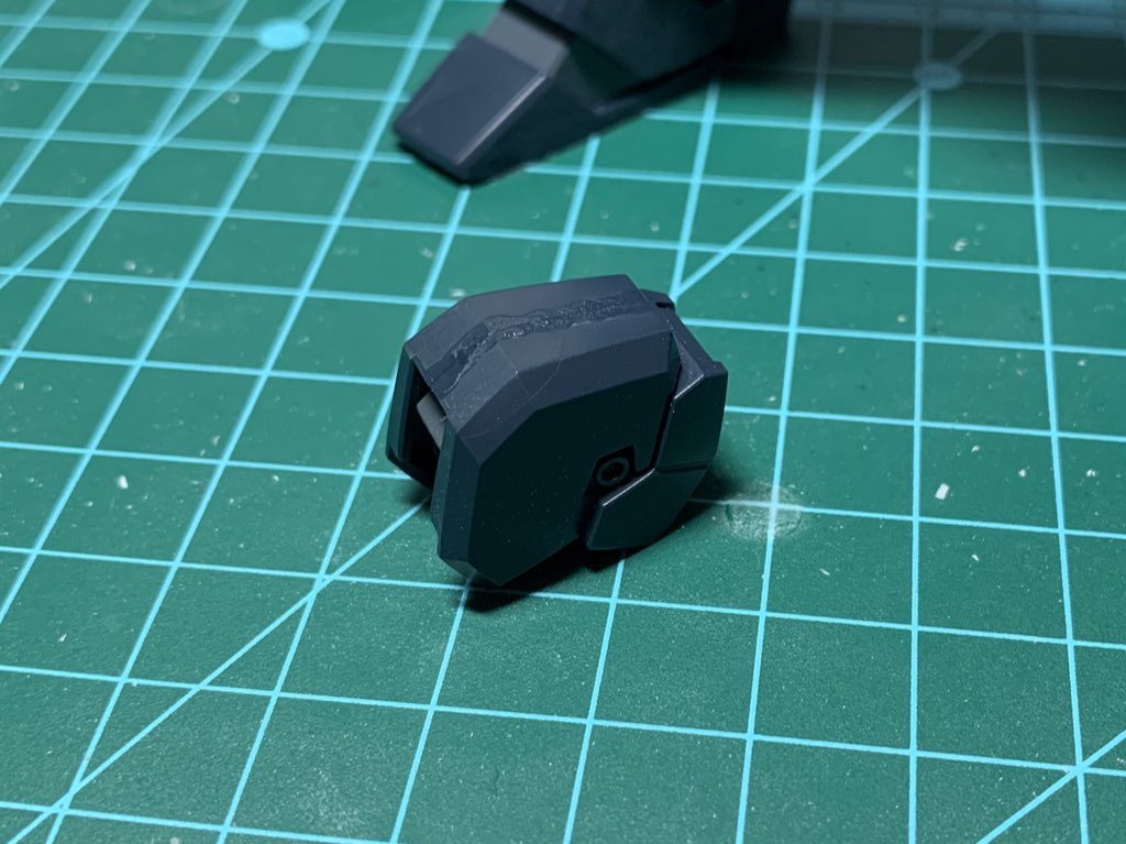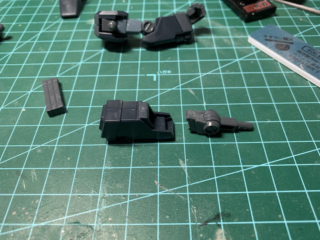 前腕部も肩と同様に合わせ目を消しますがこのままでは肘関節を外せなくなるので後ハメ加工を施しています。ジェスタの場合はピンを切り飛ばすだけなので簡単でした。