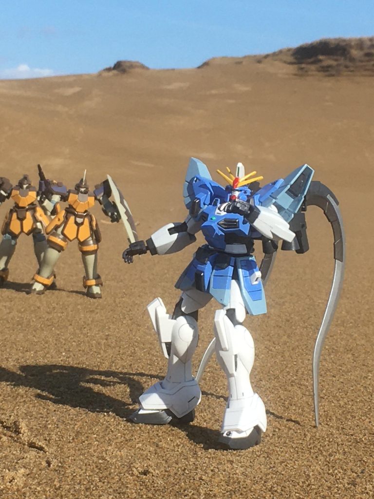 ![【オマケ写真】各ロケ地は以下の通りです。デスサイズ[海]⇒神奈川県・横須賀港湾ヘビーアームズ[ガスタンク]⇒東京都立川市・東京ガスサンドロック[砂漠・昼]⇒鳥取県・鳥取砂丘アルトロン[岩場]⇒神奈川県・鷹取山プチッガイ⇒家の庭ヘビーアームズ[ガスタンク・夕方]⇒神奈川県・川崎コンビナートデスサイズ[飛行場]⇒羽田空港第2ターミナル展望室アルトロン[岩場・仏像]⇒神奈川県・鷹取山サンドロック[砂漠・夜]⇒静岡県浜松市・中田島砂丘5機全体⇒東京都千代田区・和田倉噴水公園《撮影秘話》サンドロックは2019年の冬の満月の日を狙って鳥取砂丘に行ったんですが、夜はあいにくと雨で撮影断念。翌日昼は多少湿ってたものの何とか撮影できました。天候がほぼ決まる3日前にまた飛行機が取れるとは限らないので、夜の満月撮影リベンジは直前でも予定が組みやすい新幹線でも行ける日本三大砂丘の1つでもある近場の浜松市・中田島砂丘に変更。鳥取から2ヶ月後、浜松の当日の天候は雲一つない満月の空で絵的にはバッチリだった代わりに、撮影のベストポジションの砂丘の頂上はとてつもない強風で輸送バッグやら軽いガンプラが飛ばされてそのままゴロゴロと太平洋までぶっ飛びそうになって慌てて拾いに駆けまわったり、砂嵐で顔に砂がビシビシ当たるし真冬で寒いし…。泣きそうになりながら風が弱まったその一瞬を撮ったものです。おかげで防塵対策なんてしてないサンドロックをホテルに帰ってから全部バラしてオーバーホールしてみたら……ひとつまみできるくらい砂が入り込んでてまた泣きそうになりました(´°̥̥̥̥̥̥̥̥ω°̥̥̥̥̥̥̥̥`)羽田のデスサイズは背景に飛行機が映ってるとサイズ感が変になってしまったり、日照の加減が難しくて2回行ったり。プチッガイは当初は白いワタで雪を再現しようとしてたら、撮影予定日になんとホントに雪が降って積もってるじゃないですか!?せっかくなので本物の雪で撮りましたw5機最終カットはロケ地探しが中々大変でした。背景に複数のビルがある所が最低条件で、尚且つ縮尺に影響が出る木が多過ぎず近過ぎず、周囲に人が映らないアングルが確保できる場所となると、都心の公園で該当する所はそう多くなかったです。各地では撮影時に膝ついてローアングルで撮ったり、ディスプレイ台を片手で持ち上げながら撮ってたりしてると周りの人から奇異な目で見られたりして何とも言えない気持ちに…。今でこそ推し撮影旅行は割と認知されてきてるものの、これも至高の1枚のためにと自分に言い聞かせて耐えましたwオマケのGXは浜名湖です。ゆるキャン△でしまりんが来た国道1号線・浜名大橋と湖中の鳥居の浜辺です。](https://gumpla.jp/wp-content/uploads/2023/02/FE723BF6-EAF6-4B17-9D2F-ED4D1F438752-1024x576.jpeg)